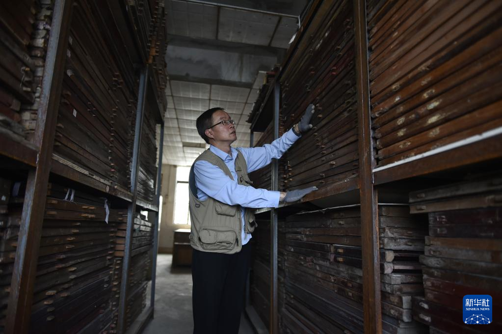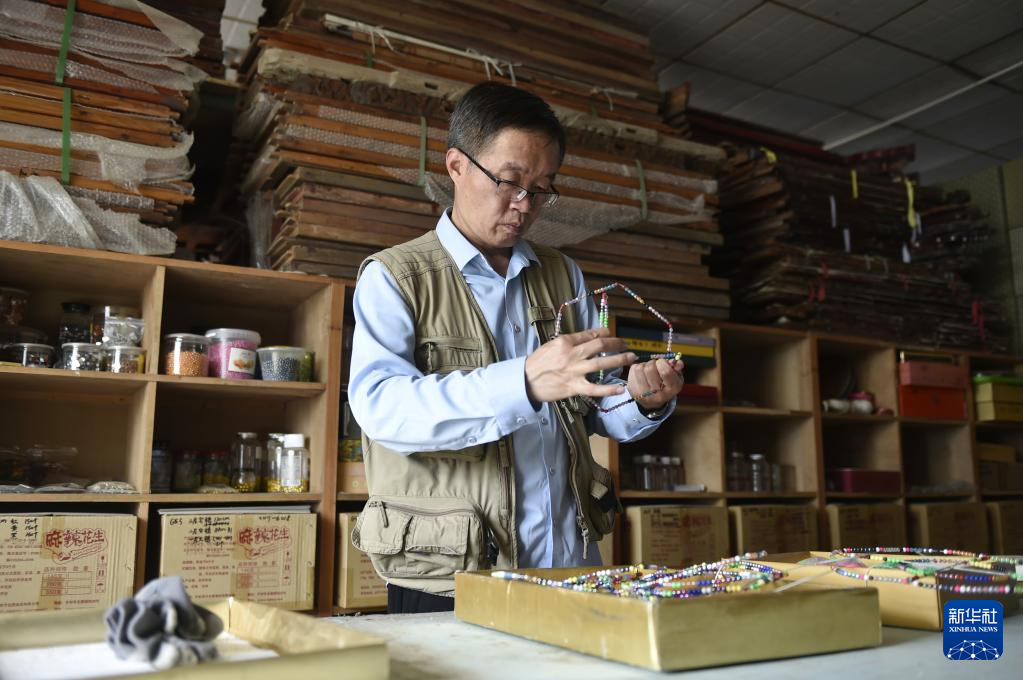 6月7日,张俊涛在库房内整理自己收集的家用传统木雕。