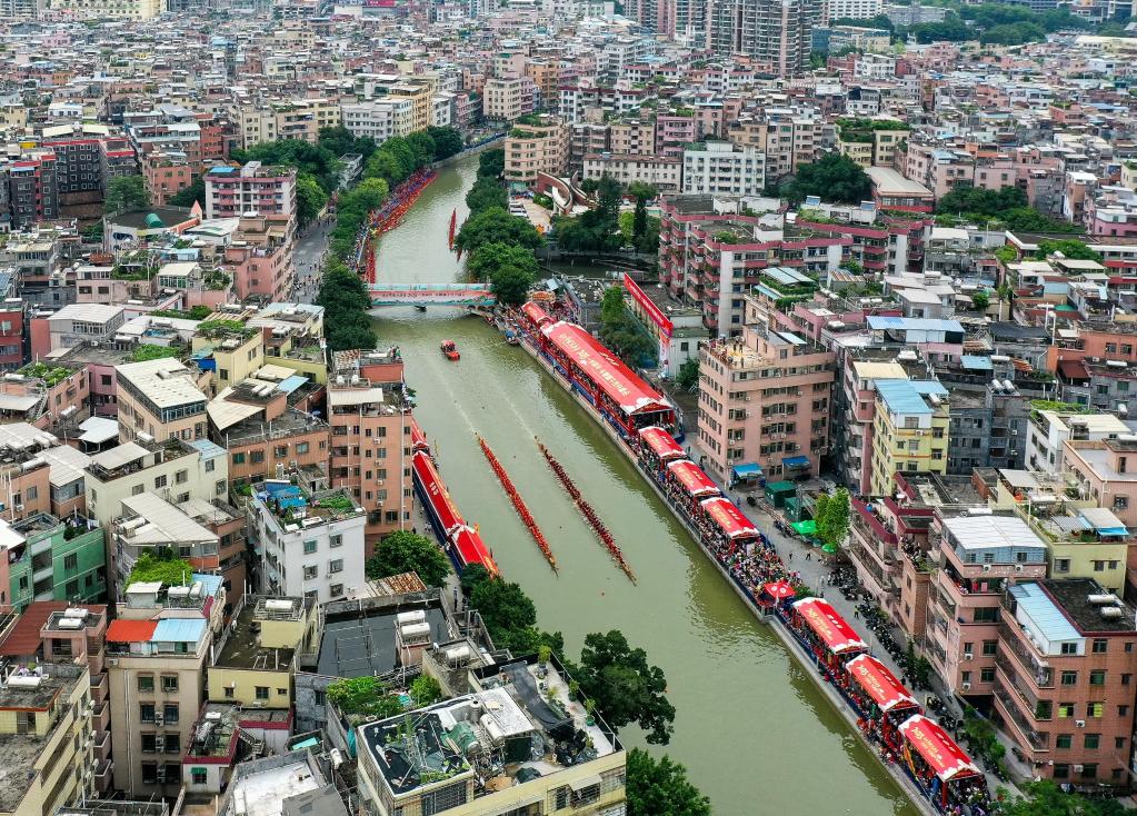 自农历四月初八“起龙舟”开始,广州地区就开启了划龙舟、迎端午的年度大戏。6月15日,车陂村12条龙船在车陂涌进行龙舟竞渡。