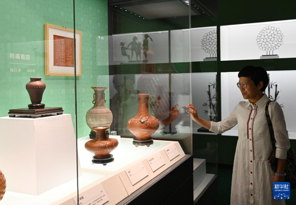 6月20日,竹编艺人陈红萍在展览现场介绍安溪的竹编工艺品。