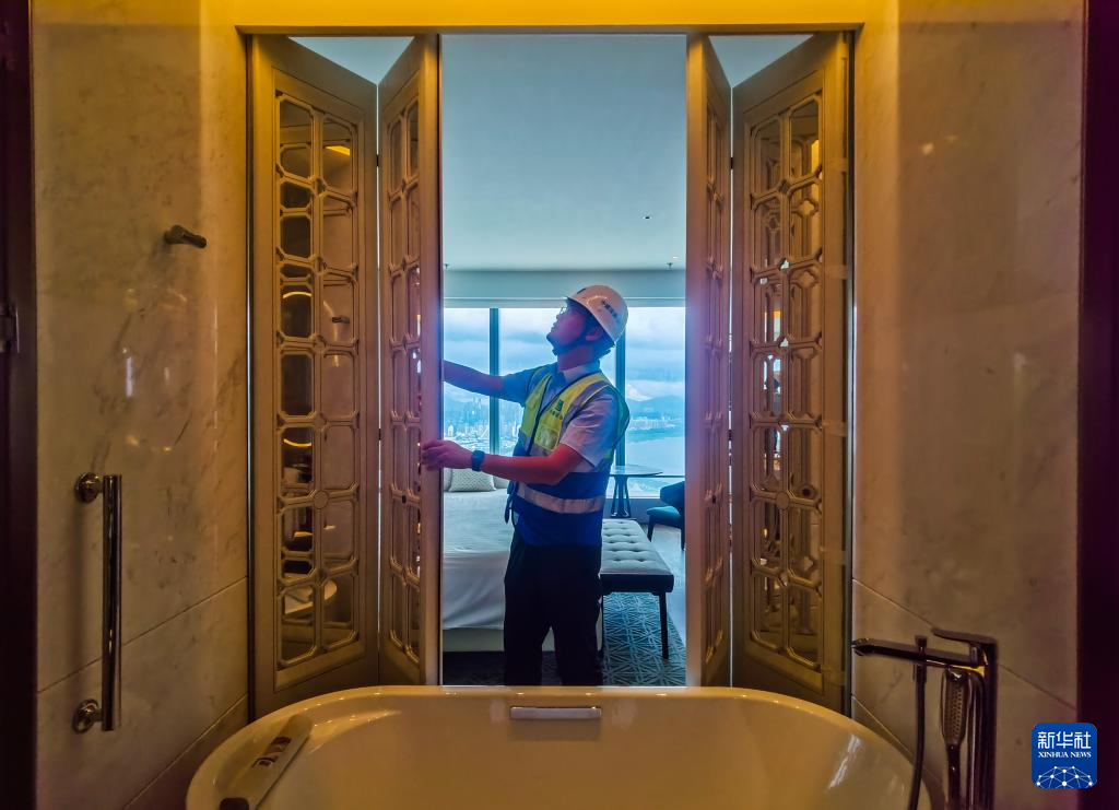 站在350米高处的深湾汇云中心空中平台,近处是深圳湾超级总部的一派繁华,一路之隔的海岸则是大片生态红树林。这栋超高楼宇的66层至79层就是伍涛团队正在打造装饰的一家国际著名品牌酒店。