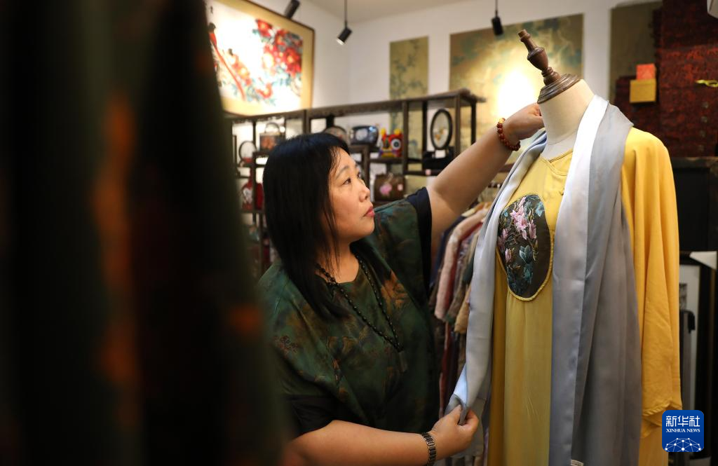 7月5日,王立君在位于辽宁省营口市辽河老街上的工作室里为一件民族服饰加上刺绣。