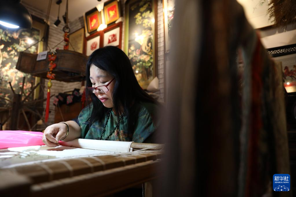 7月5日,王立君在位于辽宁省营口市辽河老街上的工作室里进行满绣创作。