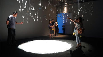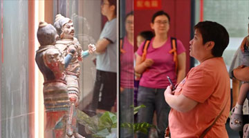 黄俊军在观看自己的铜雕作品《群仙祝寿图》(7月13日摄)。