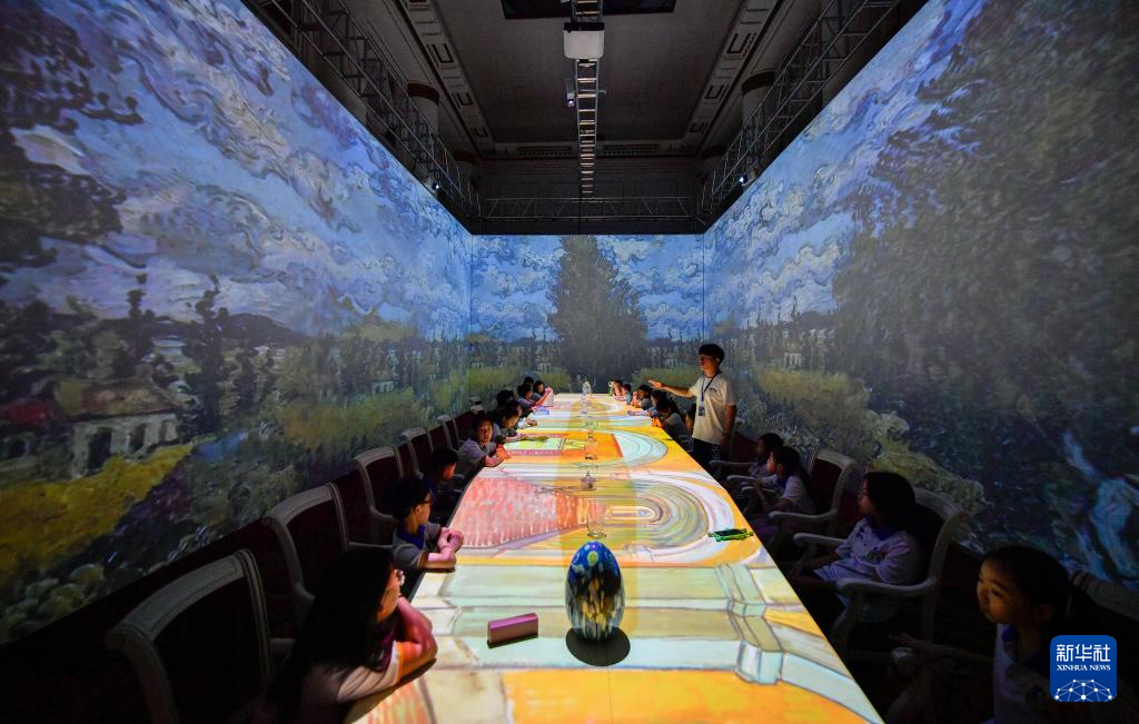 7月30日,在天津数字艺术博物馆,学生们沉浸式参观油画艺术作品。