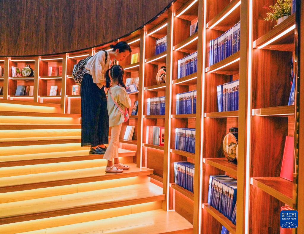 8月1日,家长和孩子在河北省遵化市新华书店挑选书籍。