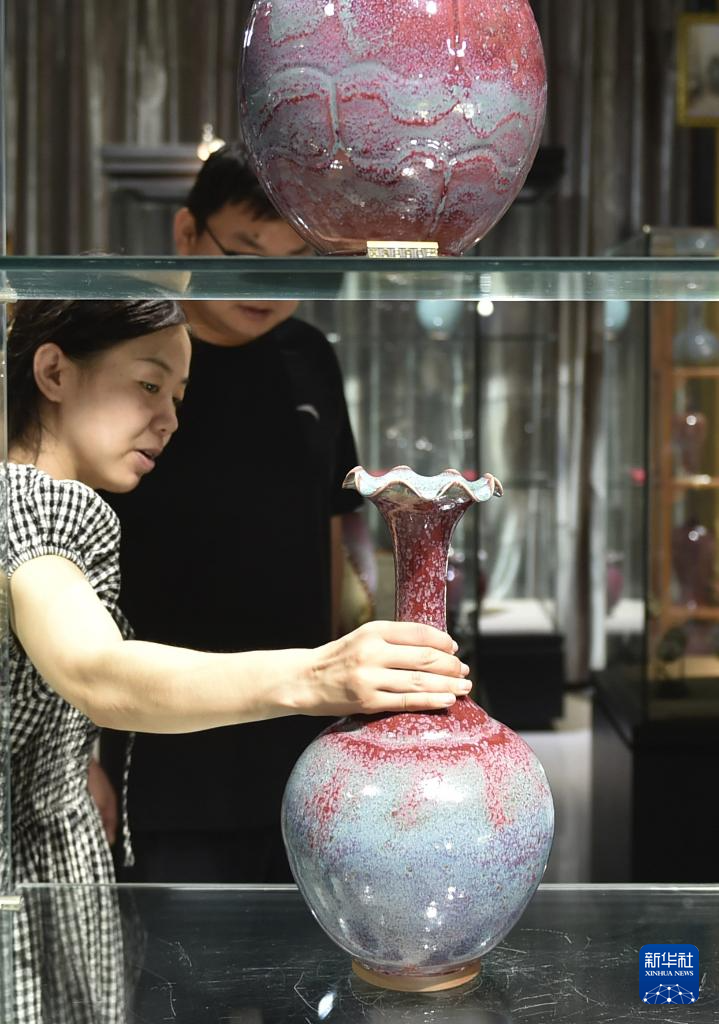 8月3日,河南省禹州市神垕镇一家钧瓷企业的工作人员在展厅里向来访者介绍钧瓷作品。