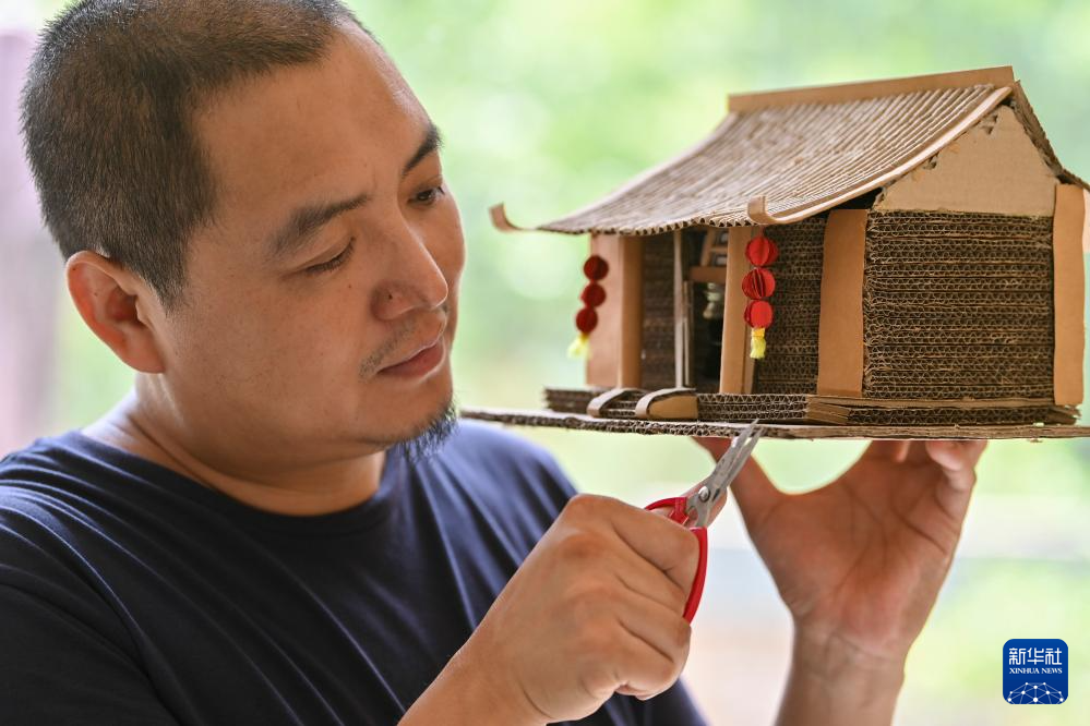王帅栋在位于山西省太原市万柏林区的工作室内修整瓦楞纸作品(8月1日摄)。