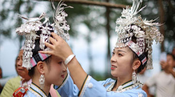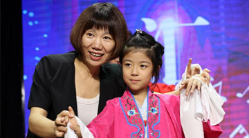 8月15日,倪朋辉向宾客展示砖雕作品。