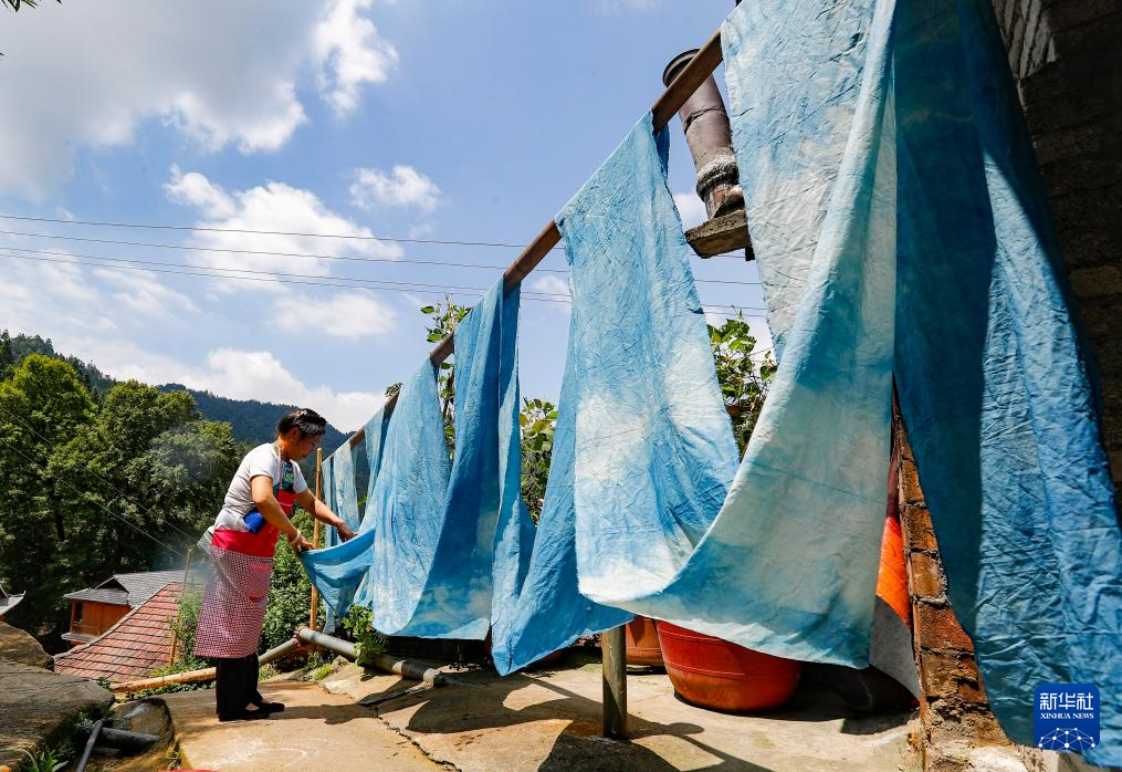 乌英苗寨妇女梁足英在晾晒第一次浸染后的布料(2023年8月31日摄)。