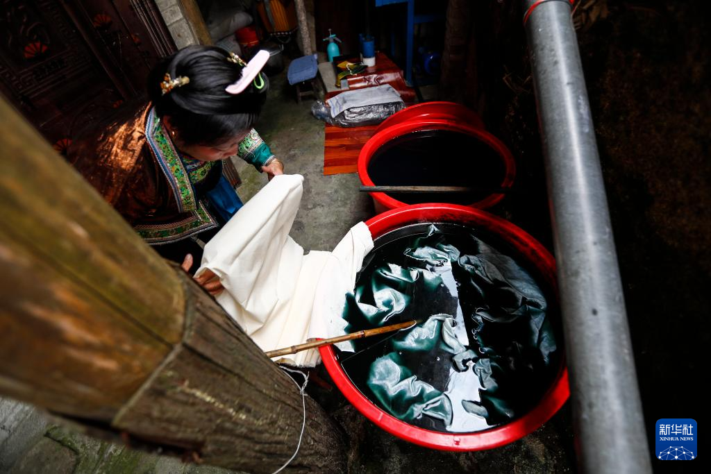 乌英苗寨妇女梁足英将白布浸染(2023年8月31日摄)。