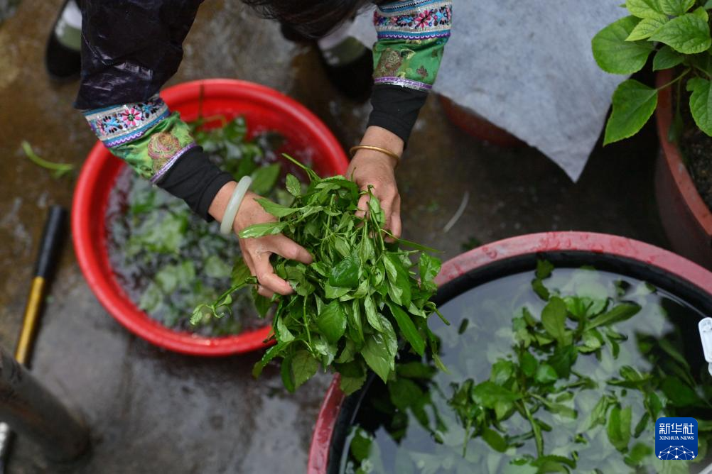 乌英苗寨妇女梁足英在用山泉水浸泡刚刚收割回来的蓝靛草(2023年8月29日摄)。
