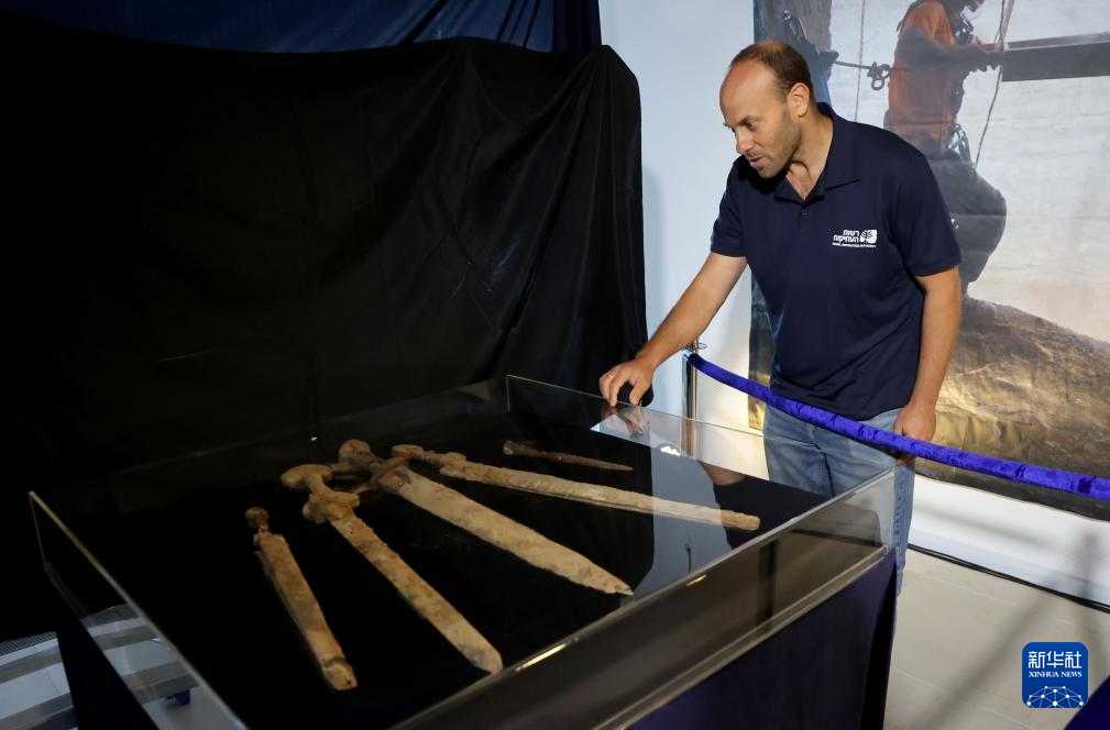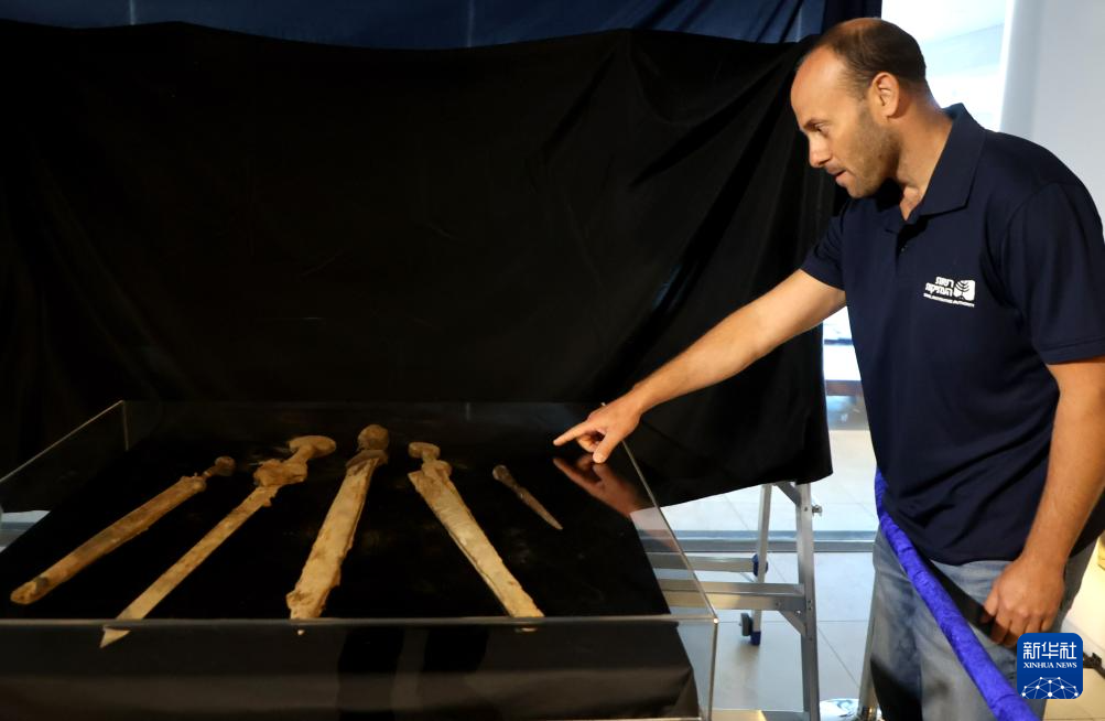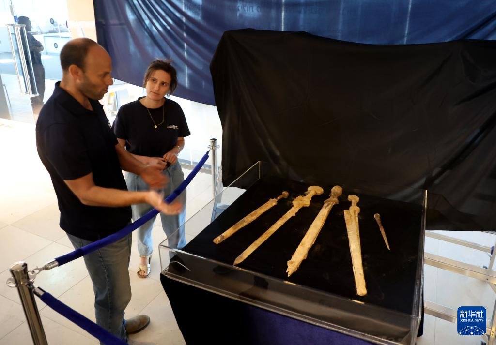 9月6日,在耶路撒冷举行的新闻发布会上,工作人员介绍新发现的古罗马时代兵器。