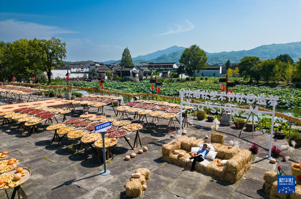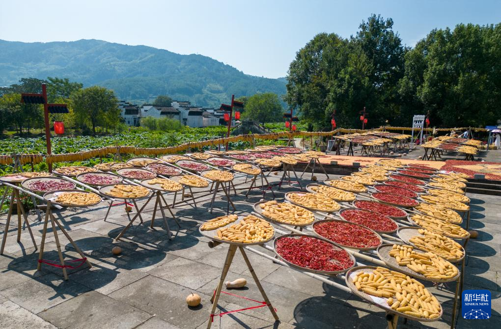 地处皖南山区的安徽省黄山市徽州区呈坎古村自古都有晒秋习俗。近年来,晒秋时节,该村村民会将农作物在村中广场集中晾晒,构成一幅五谷丰登的秋收画卷,吸引不少游客前往观赏,成为当地秋日里的旅游特色。