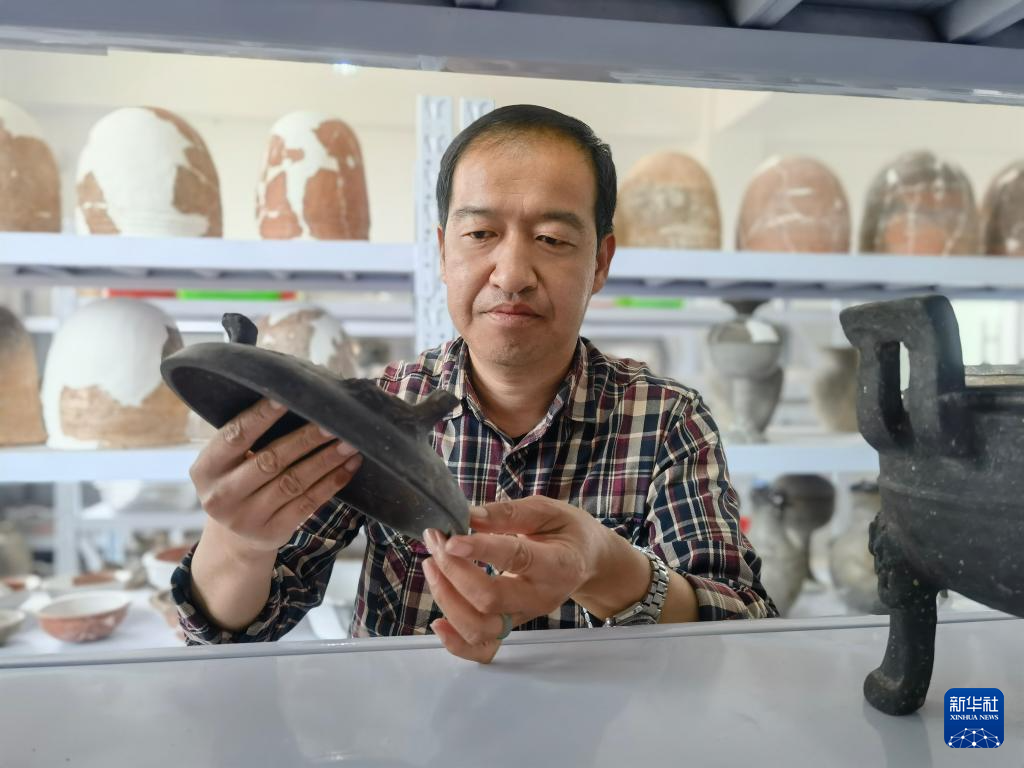 河北省文物考古研究院南阳遗址考古项目负责人雷建红查看出土的文物。(受访者供图)