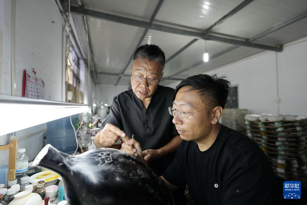9月12日,戴佩维(左)在指导儿子戴博霖陶瓷雕金技巧。