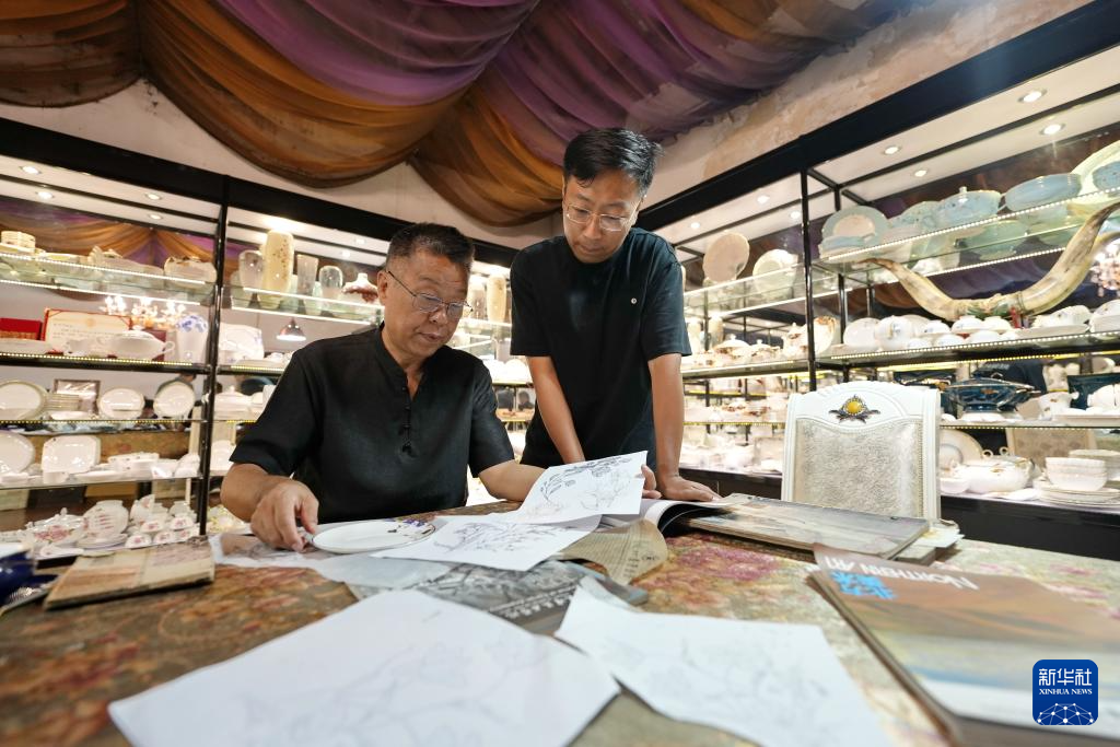 9月12日,戴佩维(左)和儿子戴博霖在研究陶瓷雕金产品制作所用图纸。