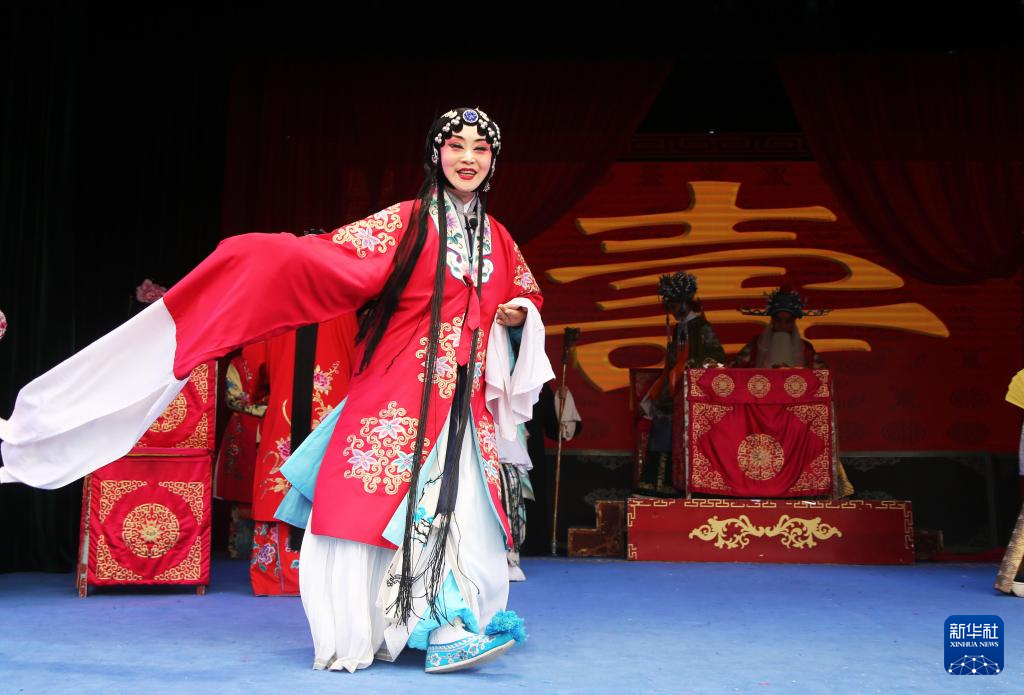 演员在甘肃省定西市体育公园演唱秦腔经典传统剧《周仁回府》(9月21日摄)。