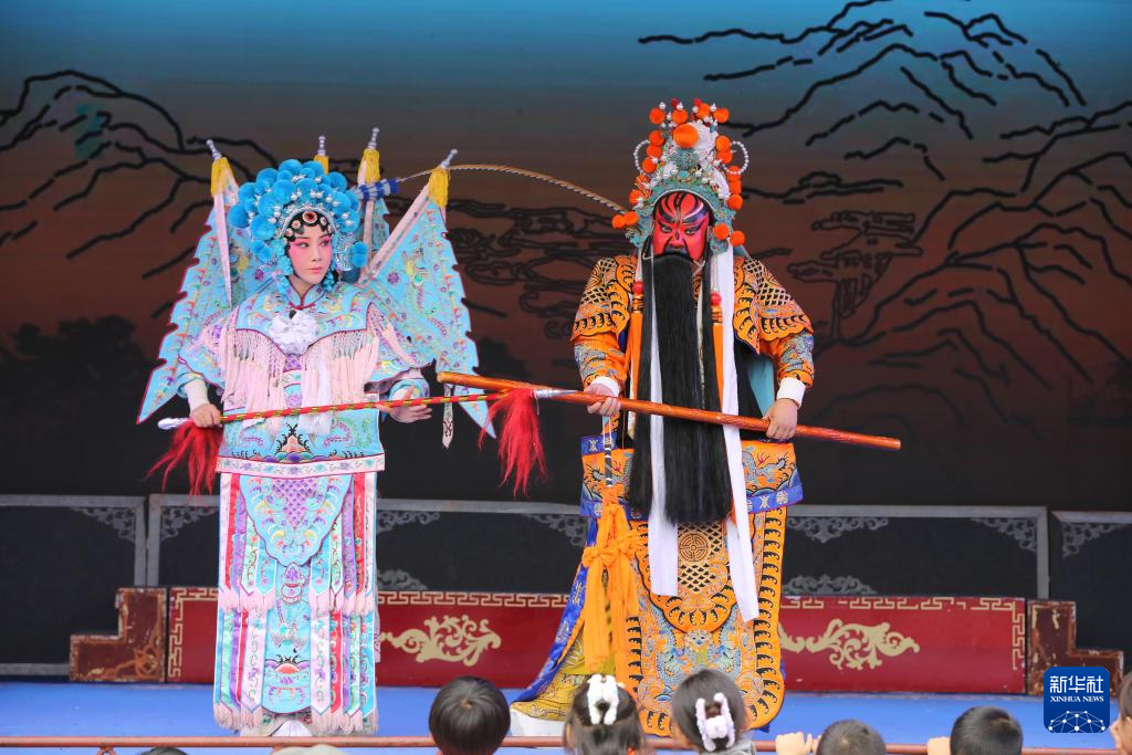中国戏剧梅花奖得主、来自宁夏秦腔剧院的国家一级演员韦小兵(右)在甘肃省定西市体育公园演唱秦腔经典传统剧《下河东》(9月23日摄)。