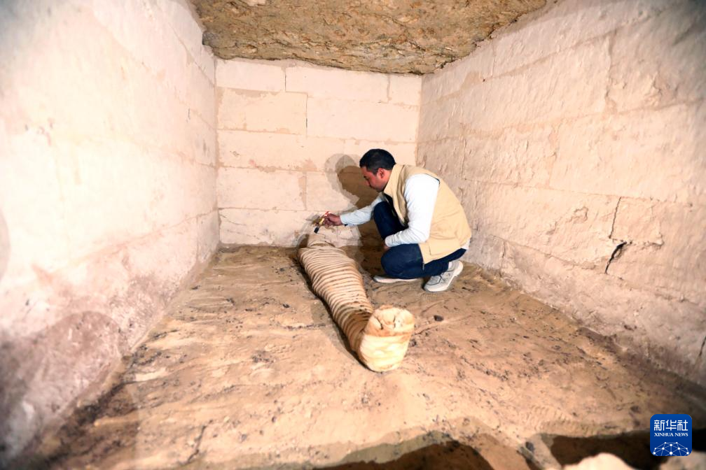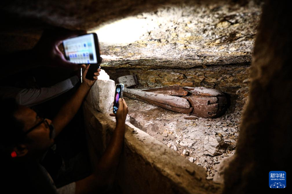 这是10月15日在埃及明亚省考古现场一座石凿墓中拍摄的木乃伊棺椁。
