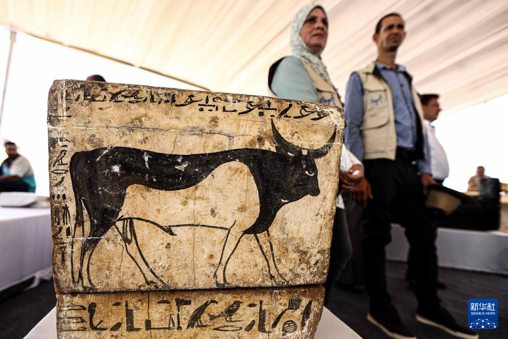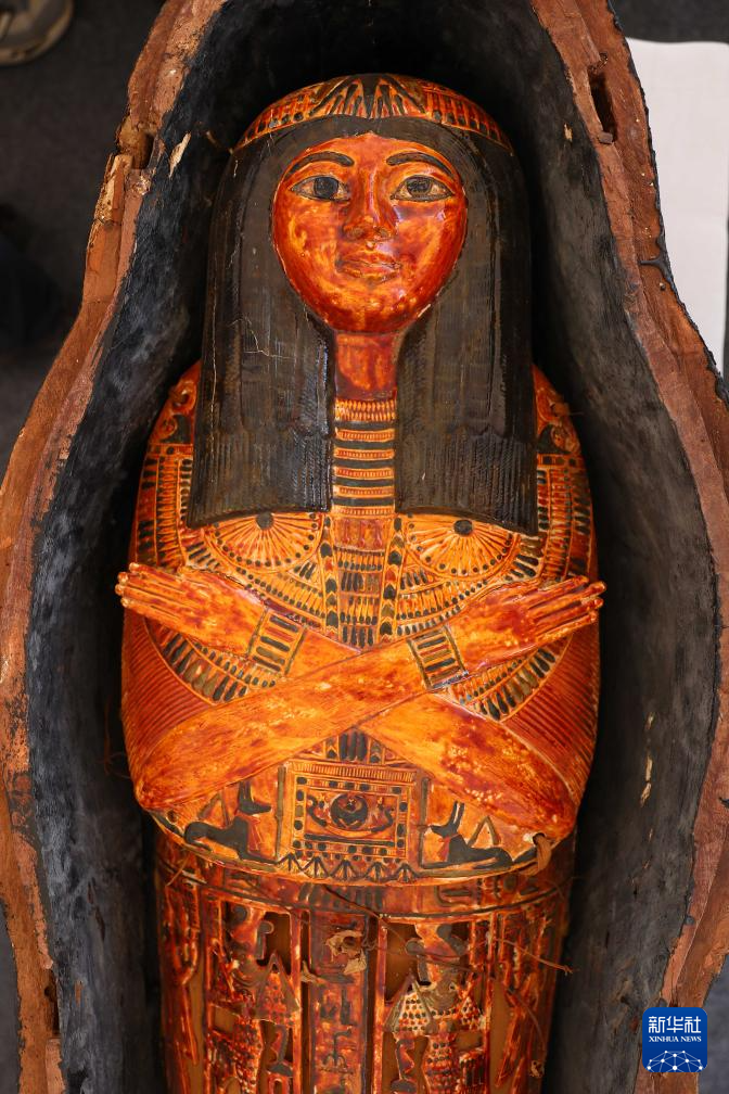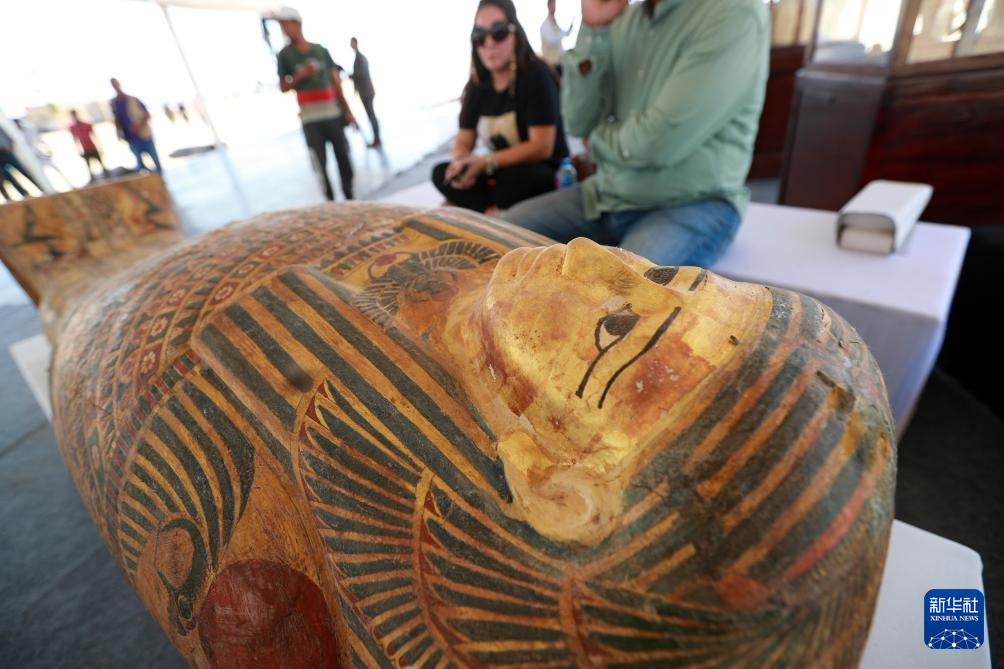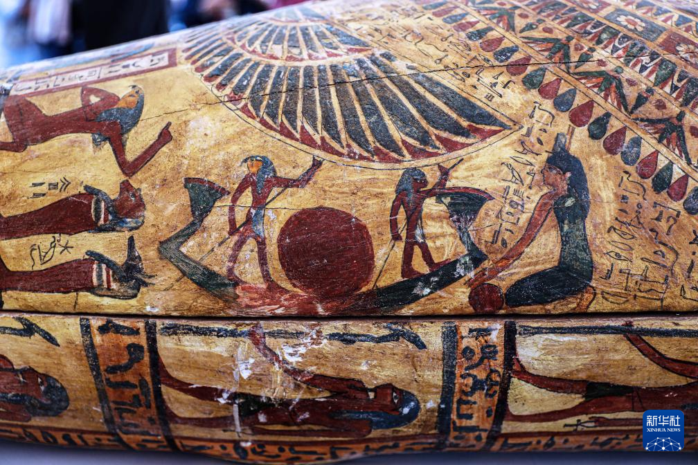 这是10月15日在埃及明亚省考古现场拍摄的彩绘木乃伊棺椁。