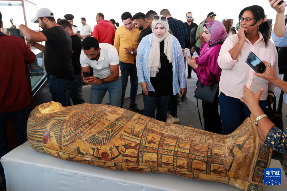 10月15日,在埃及明亚省考古现场,人们参观彩绘木乃伊棺椁。