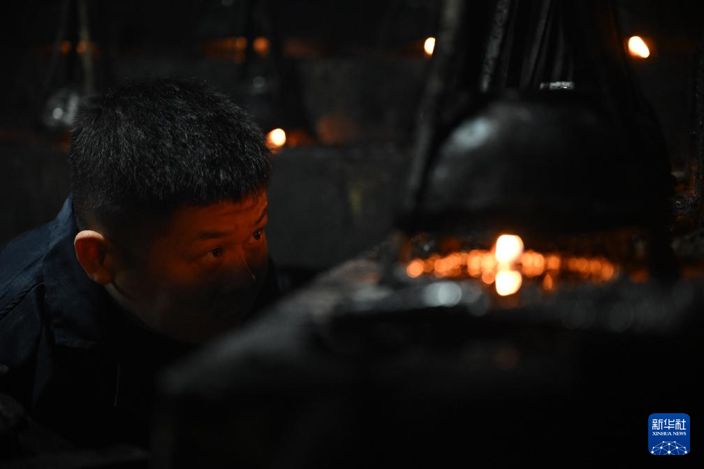 10月25日,在安徽省黄山市歙县老胡开文墨业有限公司,周健在观察桐油烟灰的收集情况。