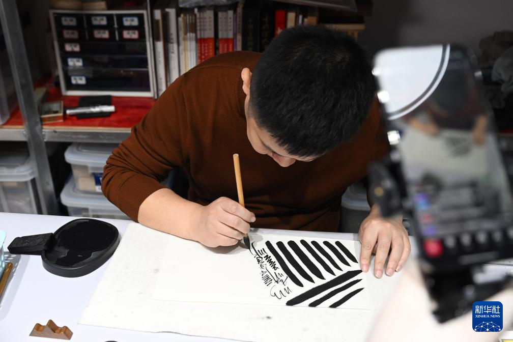 10月24日,周健直播时向网友展示徽墨的书写效果。