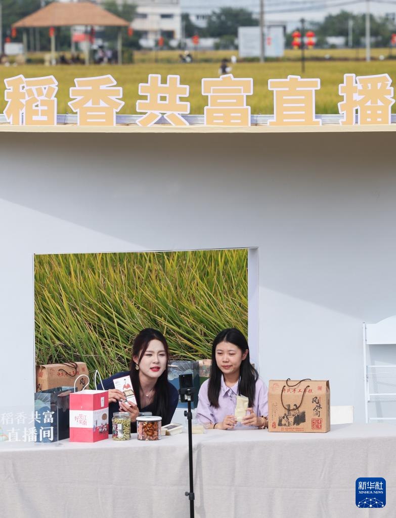 11月3日,在渔山乡千亩省级粮食生产功能区的稻田内,志愿者直播推介渔山大米、年糕等特色农产品。