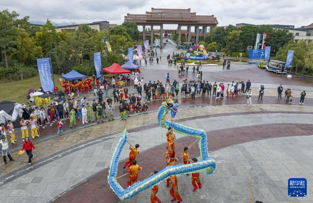 11月11日,在浙江省温州市三垟湿地公园北广场,舞龙队选手在比赛中(无人机照片)。
