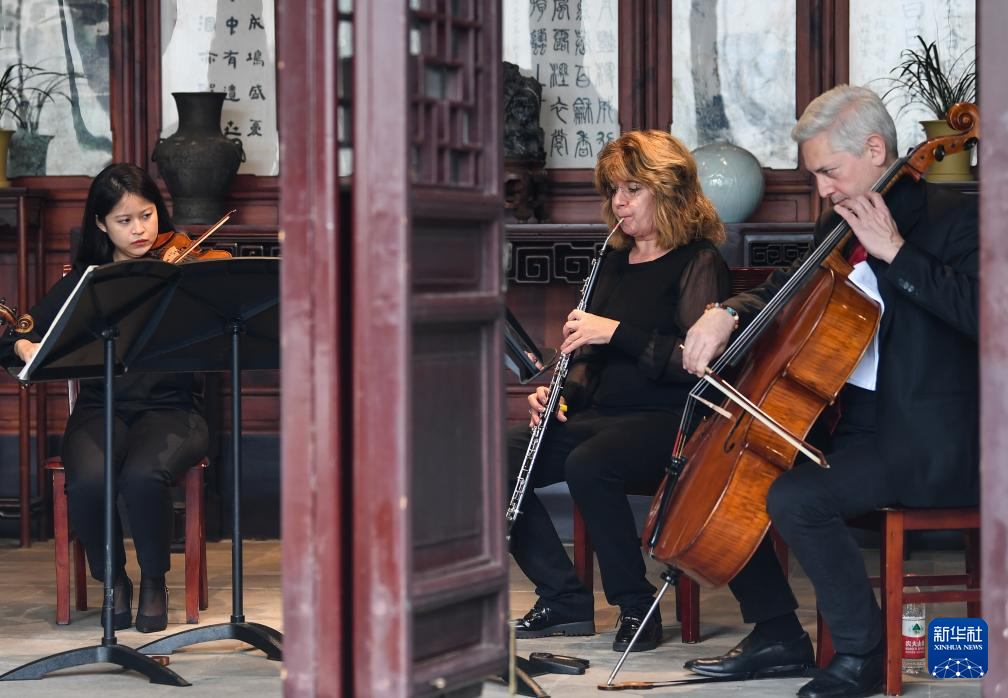 11月16日,来自费城交响乐团的演奏家们在苏州拙政园玉兰堂演奏。