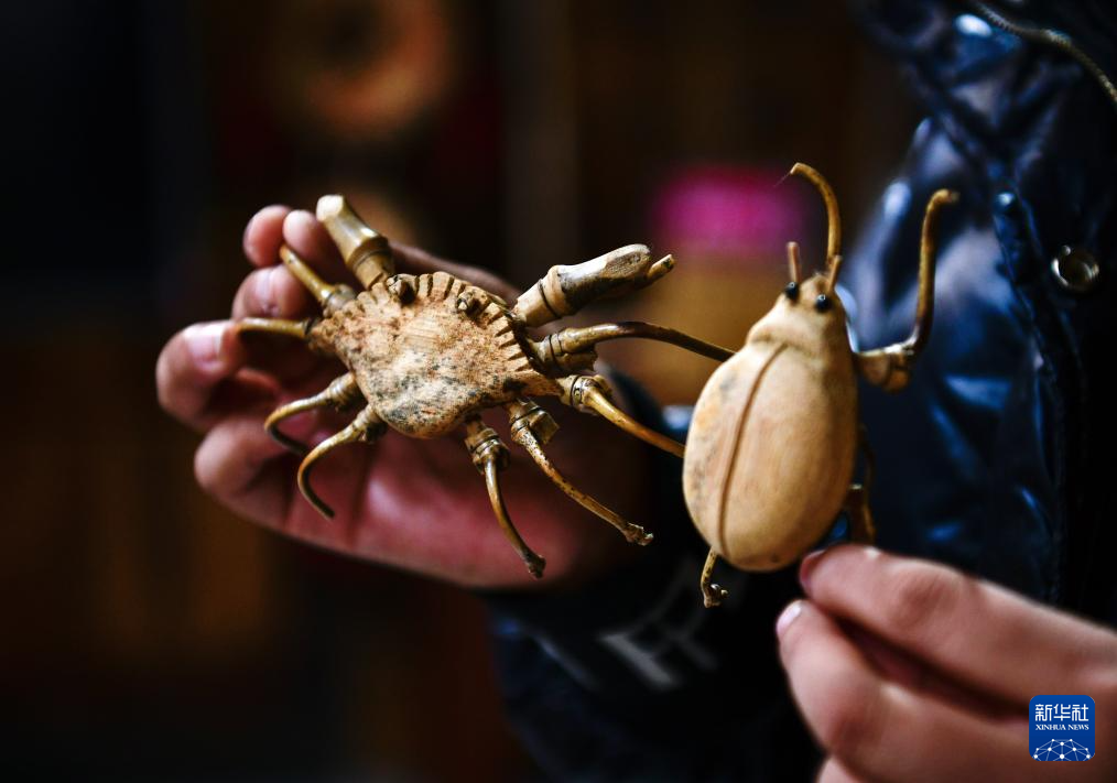 11月15日,帮扶干部在贵州省石阡县国荣乡楼上古寨的文创工坊里展示竹雕工艺品。