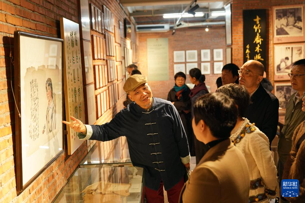 11月21日,国家级非物质文化遗产项目木版水印技艺代表性传承人、浙江十竹斋版画博物馆馆长魏立中(左)向嘉宾介绍展品。