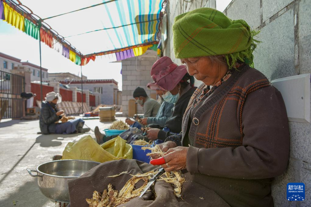 尼木县塔荣镇雪拉村村民在给狼毒草去皮,这是制作藏纸的步骤之一(12月5日摄)。