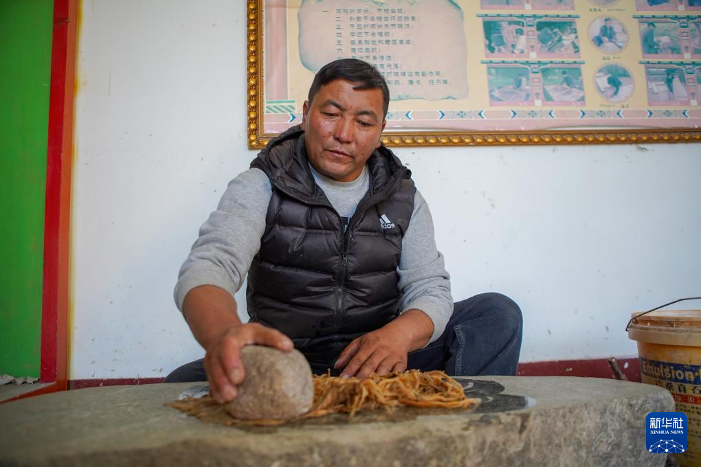 格桑旦增的弟弟普琼用石头捶打狼毒草,这是制作藏纸的步骤之一(12月5日摄)。