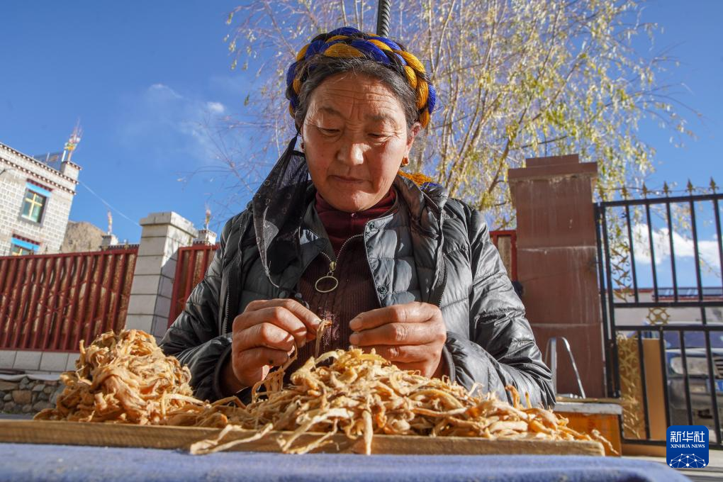 尼木县塔荣镇雪拉村村民在给狼毒草分丝,这是制作藏纸的步骤之一(12月5日摄)。