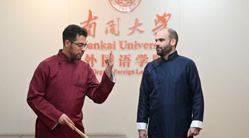 在福建泉州晋江市掌中木偶艺术保护传承中心,法希玛·巴罗奇与晋江市掌中木偶艺术保护传承中心演出队队长、市级非遗传承人陈代宫一见如故,两名中外艺术家台上台下交流互鉴,相互学习表演技艺。