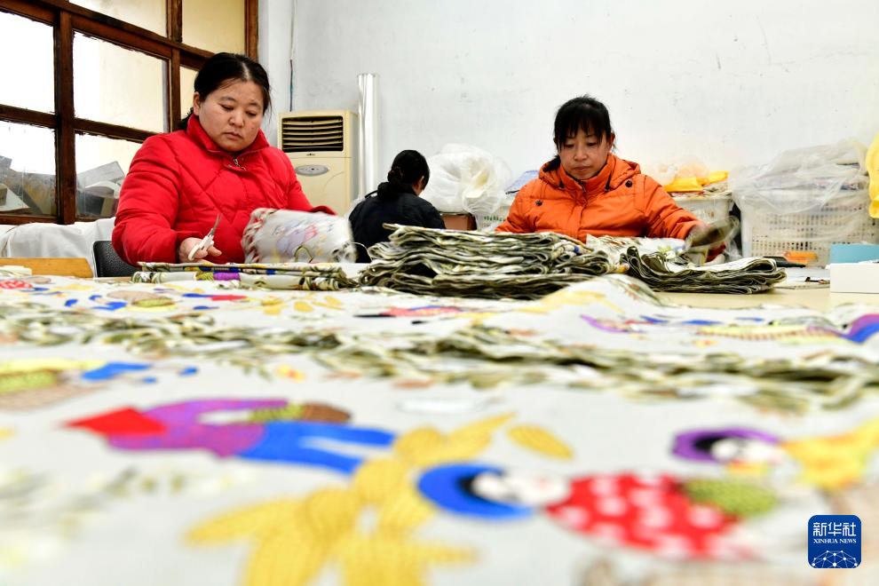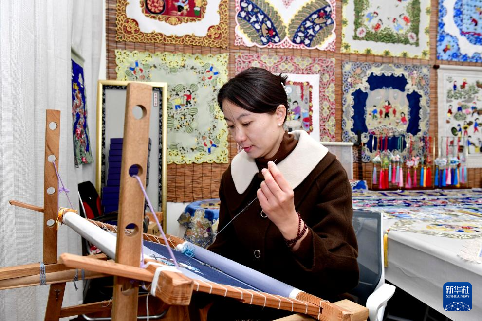 12月13日,在日照市刺绣非遗工坊,工作人员在加工刺绣产品。