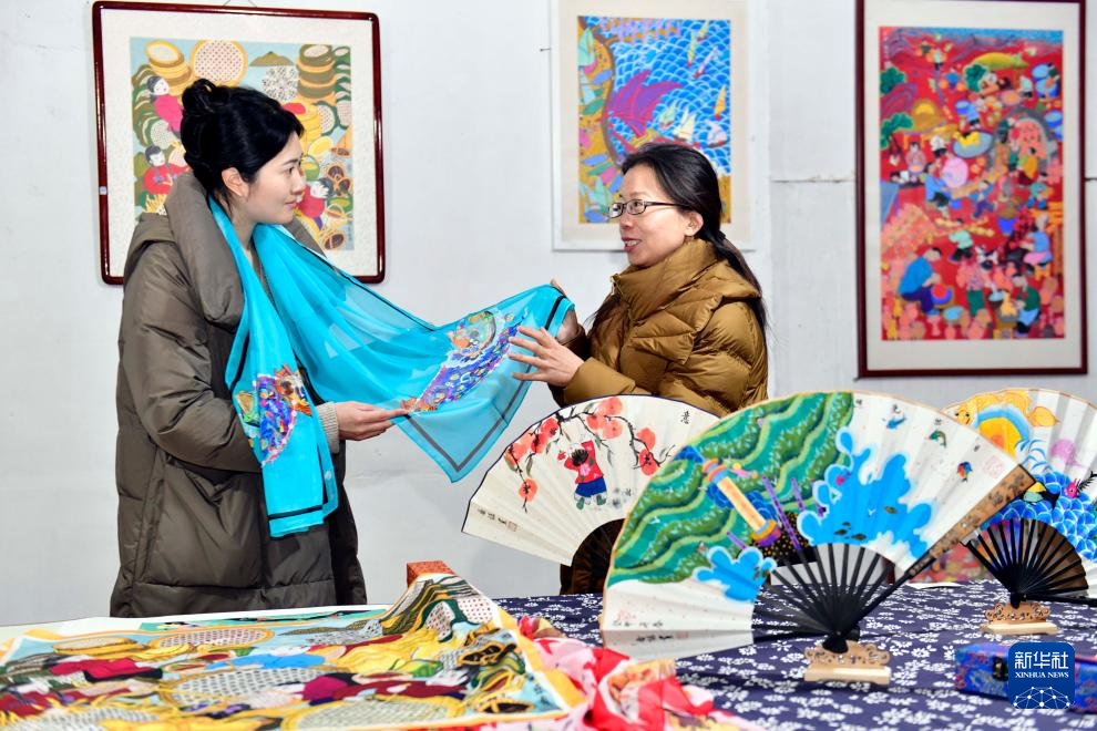 12月13日,在日照市农民画非遗工坊,非遗传承人乔诺(右)在介绍农民画衍生文创产品。