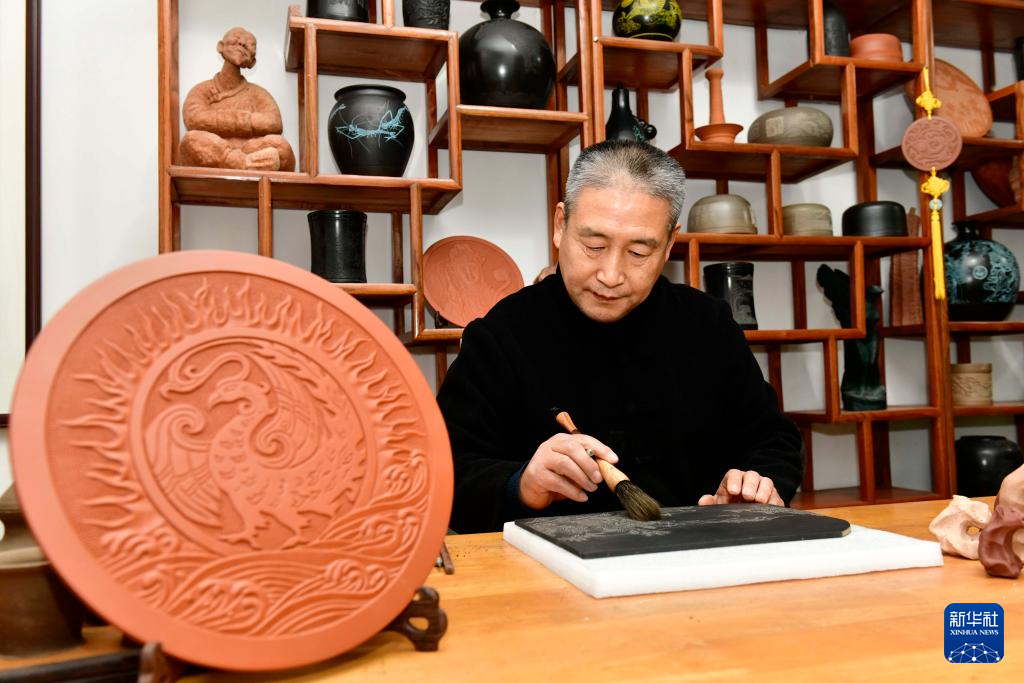12月13日,在日照市平面陶非遗工坊,非遗传承人徐冰在创作平面陶。