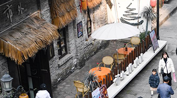 12月24日,工人在秭归县屈原祠山门前拆除脚手架(无人机照片)。