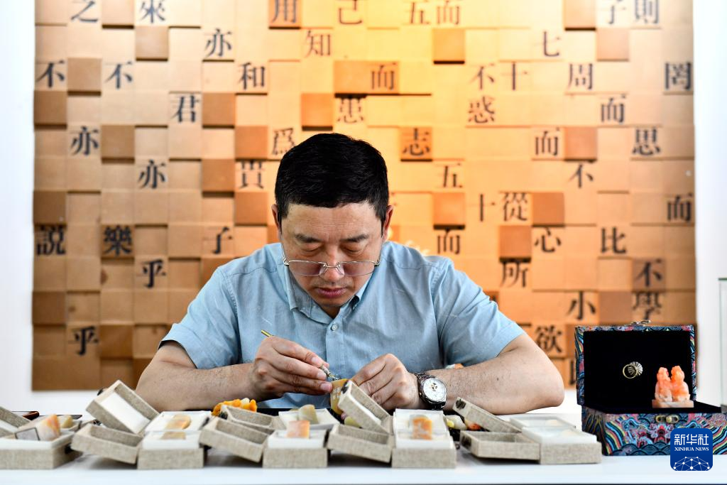 山东曲阜市尼山镇鲁源新村孔府印阁的工作人员在制作印章(2023年6月8日摄)。