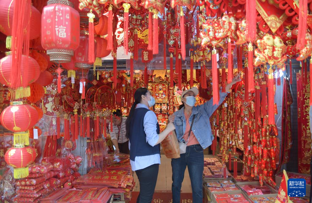 1月18日,市民在河北省唐山市海港经济开发区节庆年货市场选购迎春饰品。