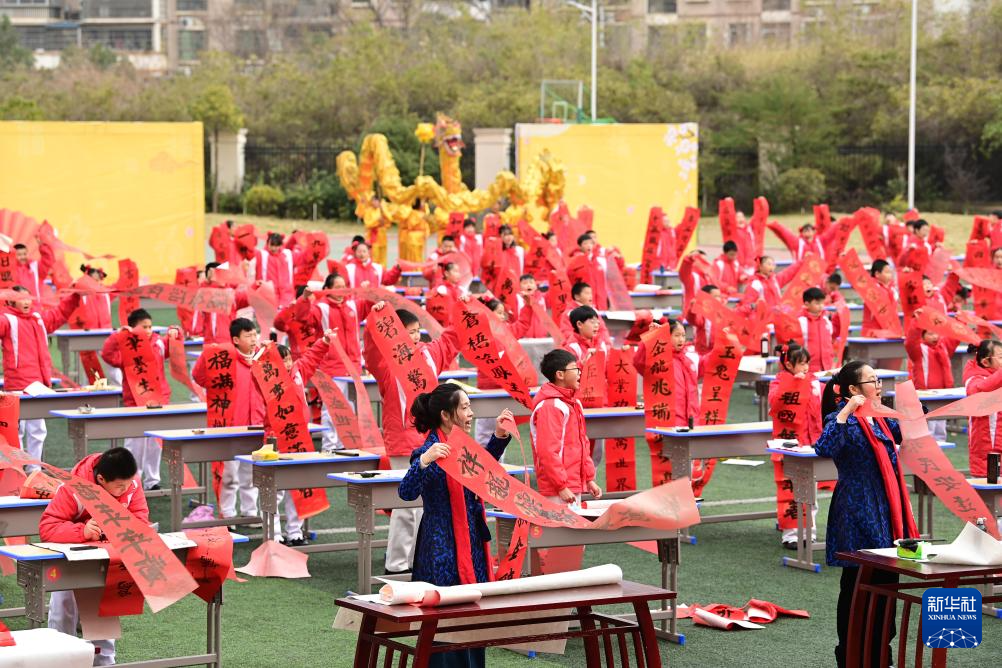 当日,江西省赣州市文清路小学举行师生集体写春联迎新春活动,学校师生在操场上挥毫泼墨,书写春联,迎接新春佳节。