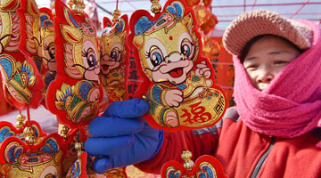 1月24日,杨秀燕在位于秀山县的金珠苗绣传承馆整理苗族服饰产品。