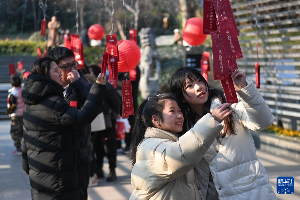 1月28日,市民在吴兴区爱山街道爱山广场猜灯谜。
