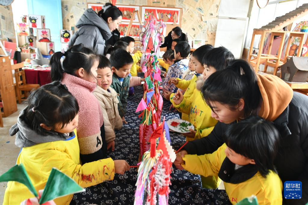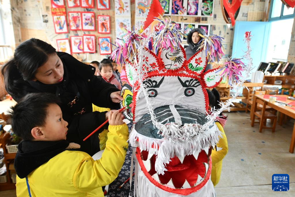 1月29日,浙江省建德市航头中心幼儿园的孩子在老师指导下为“板凳龙”添色。