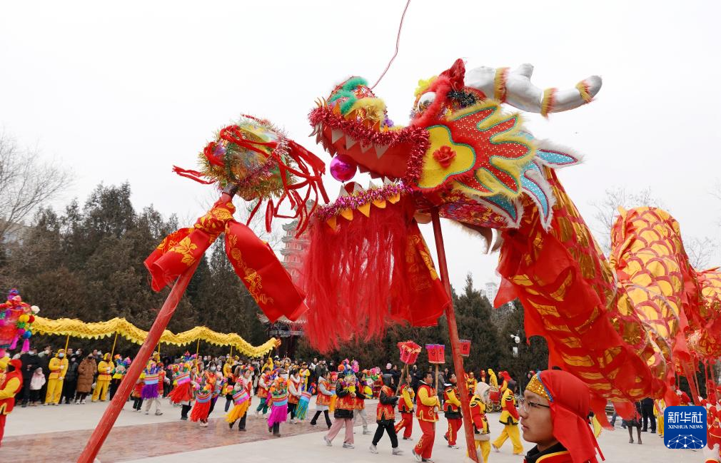 2月22日,在河南省博爱县北朱营村,村里的文艺队在表演舞狮。