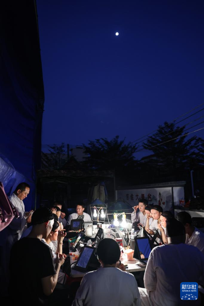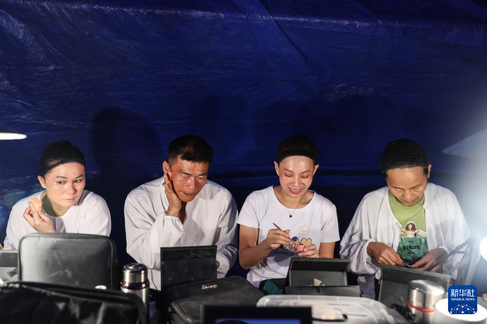 2月21日,海南定安县琼剧团的演员们在定安县后山村演出前化妆。