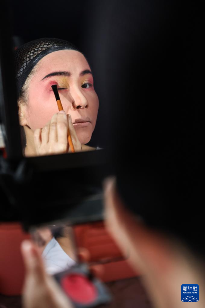 2月21日,海南定安县琼剧团的演员在定安县后山村演出前化妆。