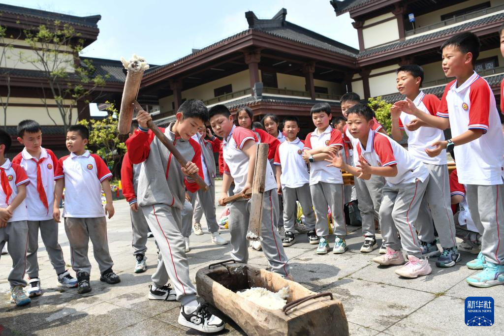 4月1日,学生在贵州省黄平县旧州古镇体验打糍粑。